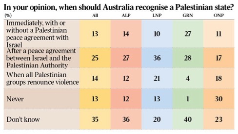 Almost as many Labor voters also support a position of never recognising a Palestinian state as those who favour immediate recognition with or without peace.