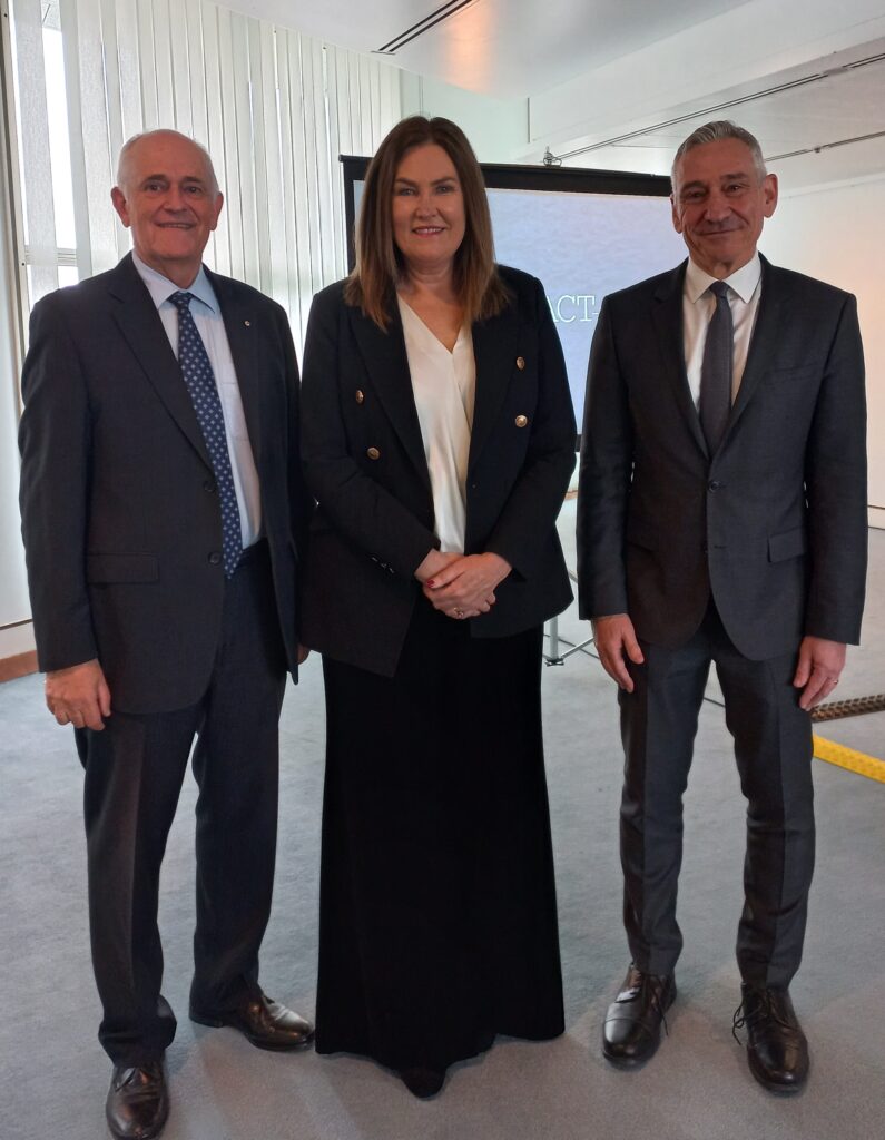 L‑R: ECAJ Co-CEO Peter Wertheim, Chair of Par­lia­men­tary Friends of Israel Sen­a­tor Deb­o­rah O’Neill and Mar­cus Sheff at the event at Par­lia­ment House on 23.5.2023.
